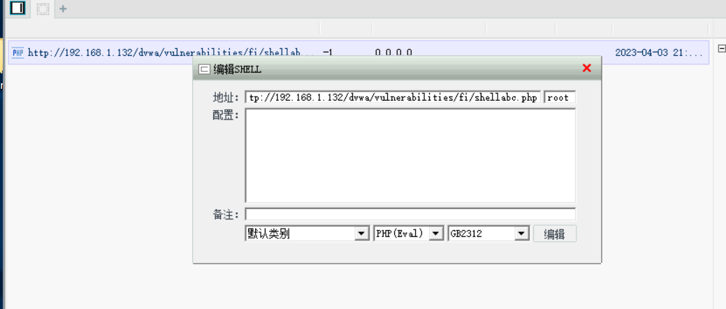 复制http://192.168.1.132/dvwa/vulnerabilities/fi/ 再加上shellabc.php 就可以去连接菜刀了