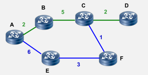 Path2: A→E→F→C→D,总路由度量是12