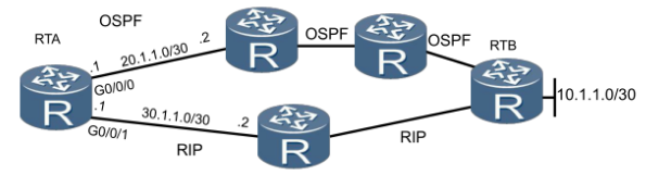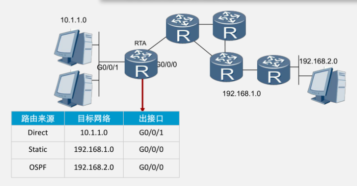 路由器通过两种路由协议学习到了网段10.1.1.0的路由虽然RIP协议提供了一条看起来更加直连的路线,但是由于OSPF具有更高的优先级,因而成为优选路由,并被加入路由表中。