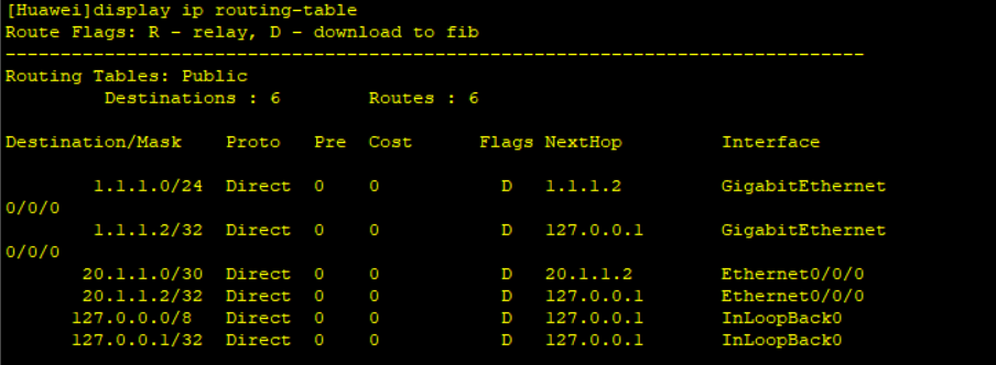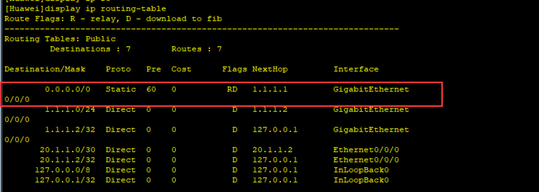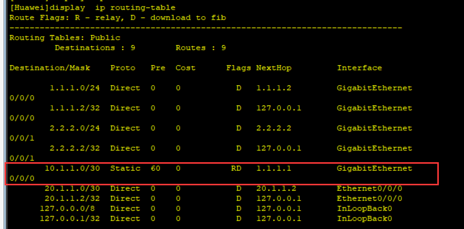 或者 [Huawei]ip route-static 10.1.1.0 30 g0/0/0