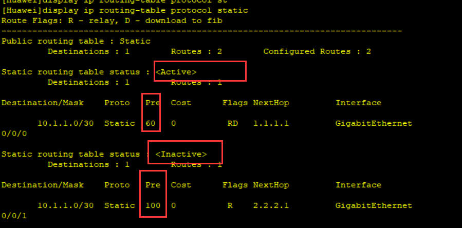 ip route-static 10.1.1.0 255.255.255.252 2.2.2.1 preference 100