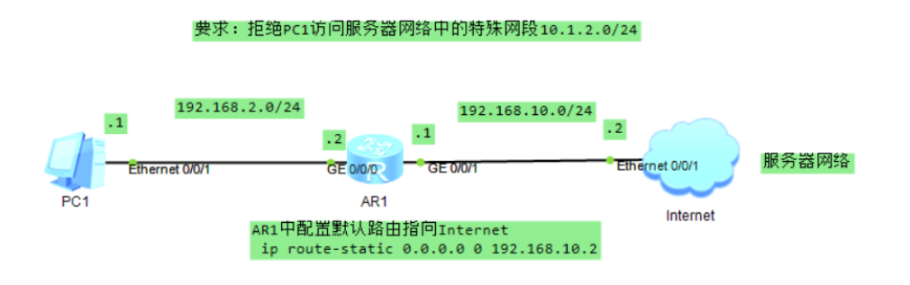 解决方法:当pc1想发送报文给服务器网络的特殊网段时,报文在AR1直接发送给逻辑出接口Null 0,相当于被AR1直接丢弃