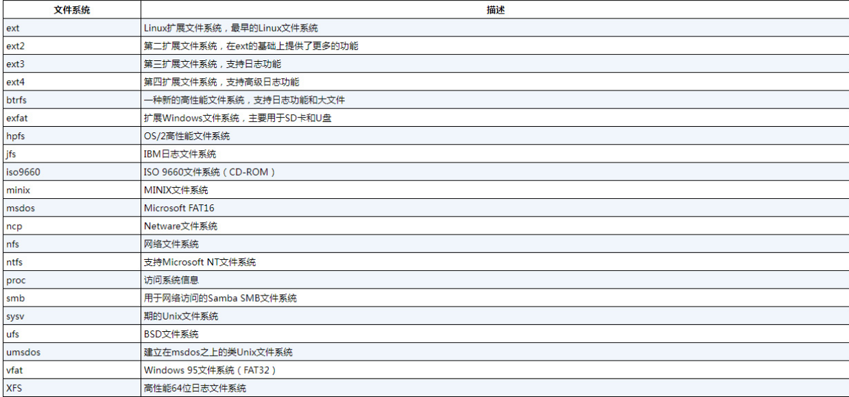 Linux服务器所访问的所有硬盘驱动器都必须采用表所列文件系统类型中的一种进行格式化。