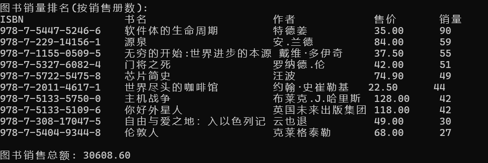 1 #include <stdio.h> 2 #define N 10 3 4 typedef struct { 5 char isbn[20]; // isbn号 6 char name[80]; // 书名 7 char author[80]; // 作者 8 double sales_price; // 售价 9 int sales_count; // 销售册数 10 } Book; 11 12 void output(Book x[], int n); 13 void sort(Book x[], int n); 14 double sales_amount(Book x[], int n); 15 16 int main() { 17 Book x[N] = {{"978-7-5327-6082-4", "门将之死", "罗纳德.伦", 42, 51}, 18 {"978-7-308-17047-5", "自由与爱之地:入以色列记", "云也退", 49 , 30}, 19 {"978-7-5404-9344-8", "伦敦人", "克莱格泰勒", 68, 27}, 20 {"978-7-5447-5246-6", "软件体的生命周期", "特德姜", 35, 90}, 21 {"978-7-5722-5475-8", "芯片简史", "汪波", 74.9, 49}, 22 {"978-7-5133-5750-0", "主机战争", "布莱克.J.哈里斯", 128, 42}, 23 {"978-7-2011-4617-1", "世界尽头的咖啡馆", "约翰·史崔勒基", 22.5, 44}, 24 {"978-7-5133-5109-6", "你好外星人", "英国未来出版集团", 118, 42}, 25 {"978-7-1155-0509-5", "无穷的开始:世界进步的本源", "戴维·多伊奇", 37.5, 55}, 26 {"978-7-229-14156-1", "源泉", "安.兰德", 84, 59}}; 27 28 printf("图书销量排名(按销售册数): \n"); 29 sort(x, N); 30 output(x, N); 31 32 printf("\n图书销售总额: %.2f\n", sales_amount(x, N)); 33 34 return 0; 35 } 36 37 // 待补足:函数output()实现 38 // ××× 39 void output(Book x[], int n) { 40 printf("%-20s %-24s %-16s %-10s %-10s\n", "ISBN", "书名", "作者", "售价", "销量"); 41 for (int i = 0; i < n; i++) { 42 printf("%-20s %-24s %-16s %-10.2f %-10d\n", 43 x[i].isbn, x[i].name, x[i].author, x[i].sales_price, x[i].sales_count); 44 } 45 } 46 47 48 // 待补足:函数sort()实现 49 // ××× 50 void sort(Book x[], int n) { 51 for (int i = 0; i < n - 1; i++) { 52 for (int j = 0; j < n - 1 - i; j++) { 53 if (x[j].sales_count < x[j + 1].sales_count) { 54 Book temp = x[j]; 55 x[j] = x[j + 1]; 56 x[j + 1] = temp; 57 } 58 } 59 } 60 } 61 62 63 // 待补足:函数sales_count()实现 64 // ××× 65 double sales_amount(Book x[], int n) { 66 double sum = 0; 67 for (int i = 0; i < n; i++) { 68 sum += x[i].sales_price * x[i].sales_count; 69 } 70 return sum; 71 }