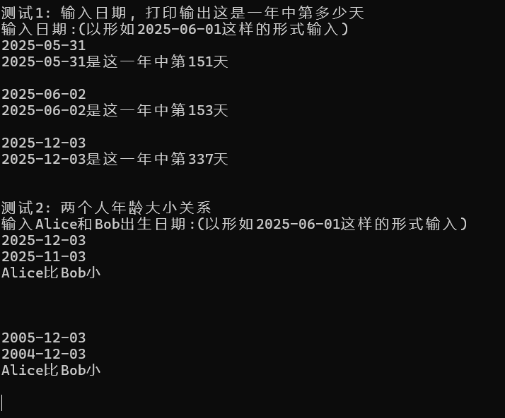 #define _CRT_SECURE_NO_WARNINGS #include <stdio.h> typedef struct { int year; int month; int day; } Date; // 函数声明 void input(Date *pd); // 输入日期给pd指向的Date变量 int day_of_year(Date d); // 返回日期d是这一年的第多少天 int compare_dates(Date d1, Date d2); // 比较两个日期: // 如果d1在d2之前,返回-1; // 如果d1在d2之后,返回1 // 如果d1和d2相同,返回0 void test1() { Date d; int i; printf("输入日期:(以形如2025-06-01这样的形式输入)\n"); for(i = 0; i < 3; ++i) { input(&d); printf("%d-%02d-%02d是这一年中第%d天\n\n", d.year, d.month, d.day, day_of_year(d)); } } void test2() { Date Alice_birth, Bob_birth; int i; int ans; printf("输入Alice和Bob出生日期:(以形如2025-06-01这样的形式输入)\n"); for(i = 0; i < 3; ++i) { input(&Alice_birth); input(&Bob_birth); ans = compare_dates(Alice_birth, Bob_birth); if(ans == 0) printf("Alice和Bob一样大\n\n"); else if(ans == -1) printf("Alice比Bob大\n\n"); else printf("Alice比Bob小\n\n"); } } int main() { printf("测试1: 输入日期, 打印输出这是一年中第多少天\n"); test1(); printf("\n测试2: 两个人年龄大小关系\n"); test2(); } // 输入日期给pd指向的Date变量 void input(Date *pd) { scanf("%d-%d-%d", &pd->year, &pd->month, &pd->day); } // 返回日期d是这一年的第多少天 int day_of_year(Date d) { int days_in_month[] = {0,31,28,31,30,31,30,31,31,30,31,30,31}; int sum = 0; int i; // 判断闰年 int is_leap = (d.year % 4 == 0 && d.year % 100 != 0) || (d.year % 400 == 0); if(is_leap) days_in_month[2] = 29; for(i = 1; i < d.month; ++i) { sum += days_in_month[i]; } sum += d.day; return sum; } // 比较两个日期 int compare_dates(Date d1, Date d2) { if(d1.year < d2.year) return -1; if(d1.year > d2.year) return 1; if(d1.month < d2.month) return -1; if(d1.month > d2.month) return 1; if(d1.day < d2.day) return -1; if(d1.day > d2.day) return 1; return 0; }