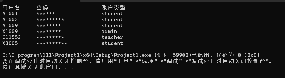 1 #include <stdio.h> 2 #include <string.h> 3 4 enum Role {admin, student, teacher}; 5 6 typedef struct { 7 char username[20]; // 用户名 8 char password[20]; // 密码 9 enum Role type; // 账户类型 10 } Account; 11 12 // 输出账户数组x中n个账户信息,密码用*替代显示 13 void output(Account x[], int n) { 14 const char *role_str[] = {"admin", "student", "teacher"}; 15 printf("%-10s %-20s %-10s\n", "用户名", "密码", "账户类型"); 16 for (int i = 0; i < n; ++i) { 17 printf("%-10s ", x[i].username); 18 int len = (int)strlen(x[i].password); 19 for (int j = 0; j < len; ++j) { 20 putchar('*'); 21 } 22 printf("%*s", 20 - len, ""); // 补齐密码字段宽度 23 printf(" %-10s\n", role_str[x[i].type]); 24 } 25 } 26 27 int main() { 28 Account x[] = {{"A1001", "123456", student}, 29 {"A1002", "123abcdef", student}, 30 {"A1009", "xyz12121", student}, 31 {"X1009", "9213071x", admin}, 32 {"C11553", "129dfg32k", teacher}, 33 {"X3005", "921kfmg917", student}}; 34 int n; 35 n = sizeof(x)/sizeof(Account); 36 output(x, n); 37 38 return 0; 39 }