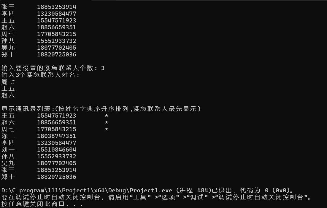 1 #define _crt_secure_no_warnings 2 #include <stdio.h> 3 #include <string.h> 4 5 typedef struct { 6 char name[20]; // 姓名 7 char phone[12]; // 手机号 8 int vip; // 是否为紧急联系人,是取1;否则取0 9 } contact; 10 11 12 // 函数声明 13 void set_vip_contact(contact x[], int n, char name[]); // 设置紧急联系人 14 void output(contact x[], int n); // 输出x中联系人信息 15 void display(contact x[], int n); // 按联系人姓名字典序升序显示信息,紧急联系人最先显示 16 17 18 #define n 10 19 int main() { 20 contact list[n] = {{"刘一", "15510846604", 0}, 21 {"陈二", "18038747351", 0}, 22 {"张三", "18853253914", 0}, 23 {"李四", "13230584477", 0}, 24 {"王五", "15547571923", 0}, 25 {"赵六", "18856659351", 0}, 26 {"周七", "17705843215", 0}, 27 {"孙八", "15552933732", 0}, 28 {"吴九", "18077702405", 0}, 29 {"郑十", "18820725036", 0}}; 30 int vip_cnt, i; 31 char name[20]; 32 33 printf("显示原始通讯录信息: \n"); 34 output(list, n); 35 36 printf("\n输入要设置的紧急联系人个数: "); 37 scanf("%d", &vip_cnt); 38 39 printf("输入%d个紧急联系人姓名:\n", vip_cnt); 40 for(i = 0; i < vip_cnt; ++i) { 41 scanf("%s", name); 42 set_vip_contact(list, n, name); 43 } 44 45 printf("\n显示通讯录列表:(按姓名字典序升序排列,紧急联系人最先显示)\n"); 46 display(list, n); 47 48 return 0; 49 } 50 51 // 设置联系人为紧急联系人 52 void set_vip_contact(contact x[], int n, char name[]) { 53 for (int i = 0; i < n; ++i) { 54 if (strcmp(x[i].name, name) == 0) { 55 x[i].vip = 1; 56 } 57 } 58 } 59 60 // 按姓名字典序升序显示,紧急联系人最先显示 61 void display(contact x[], int n) { 62 contact temp[n]; 63 // 复制原数组 64 for (int i = 0; i < n; ++i) { 65 temp[i] = x[i]; 66 } 67 // 按姓名字典序升序排序 68 for (int i = 0; i < n - 1; ++i) { 69 for (int j = 0; j < n - 1 - i; ++j) { 70 if (strcmp(temp[j].name, temp[j + 1].name) > 0) { 71 contact t = temp[j]; 72 temp[j] = temp[j + 1]; 73 temp[j + 1] = t; 74 } 75 } 76 } 77 // 先输出紧急联系人 78 for (int i = 0; i < n; ++i) { 79 if (temp[i].vip) { 80 printf("%-10s%-15s%5s\n", temp[i].name, temp[i].phone, "*"); 81 } 82 } 83 // 再输出非紧急联系人 84 for (int i = 0; i < n; ++i) { 85 if (!temp[i].vip) { 86 printf("%-10s%-15s\n", temp[i].name, temp[i].phone); 87 } 88 } 89 } 90 91 void output(contact x[], int n) { 92 int i; 93 94 for(i = 0; i < n; ++i) { 95 printf("%-10s%-15s", x[i].name, x[i].phone); 96 if(x[i].vip) 97 printf("%5s", "*"); 98 printf("\n"); 99 } 100 }