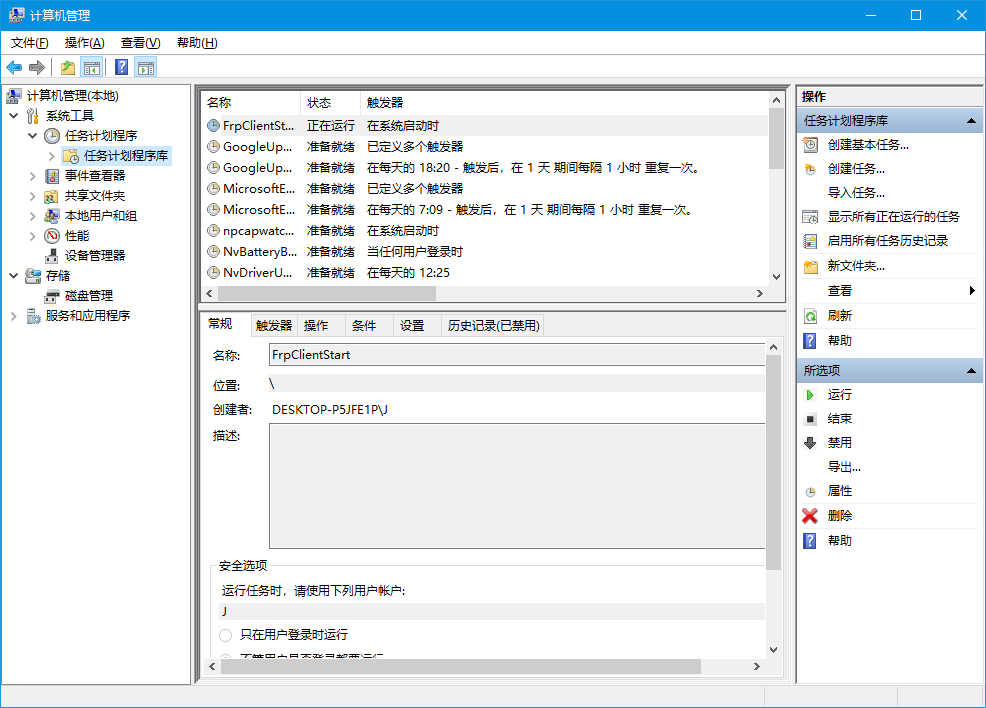 在操作选项卡新建,在”程序和脚本“中选择刚才frpc.ini所在文件夹下的frpc.exe, ”添加参数“输入 -c frpc.ini,”起始于“中输入刚才frpc.ini所在文件夹