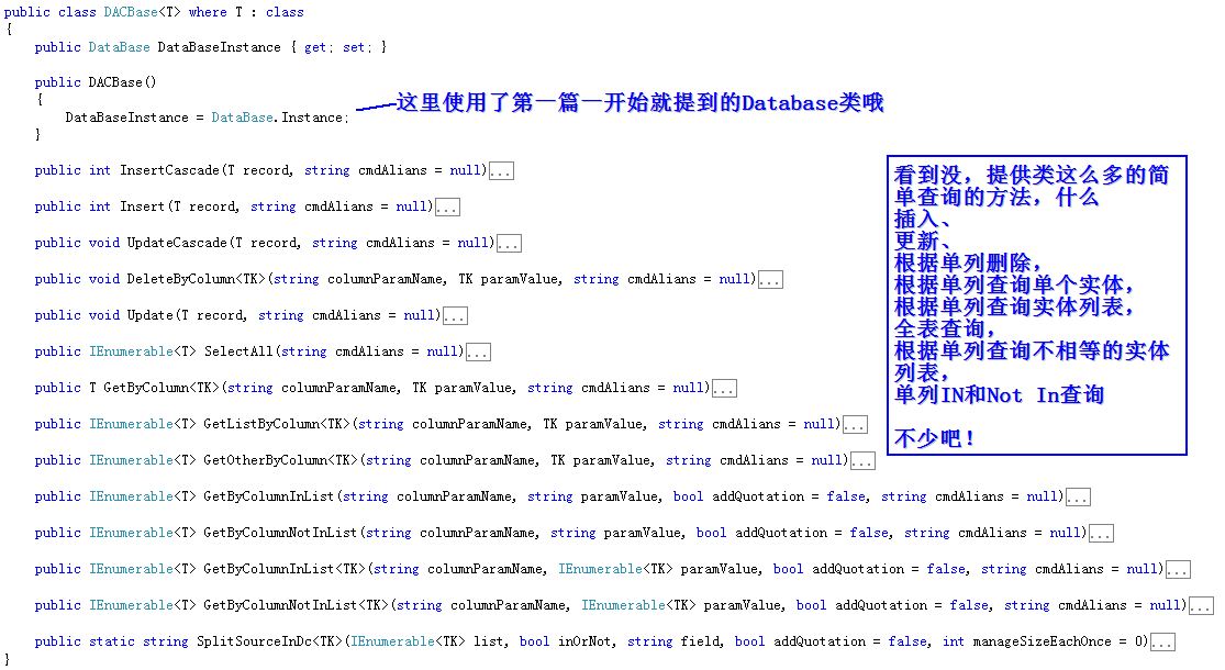 哥马上创建了一个DACBase<T> 类,简单的查询你就不要创建自己的DAC类了,直接用它吧:
