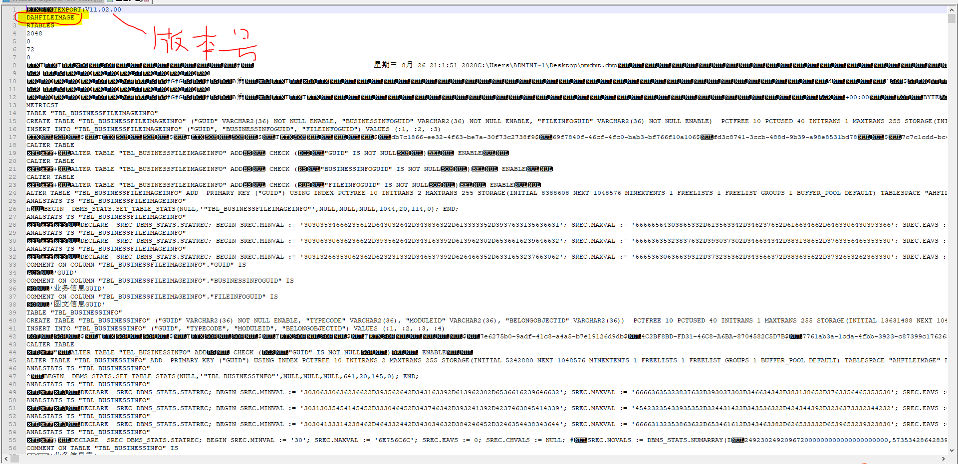1、当表空间名称不同时,使用notepad++打开dmp数据库文件,批量修改表空间名称,注意第二行D×××表空间名称不能修改,如图;需要注意数据库的版本,若版本不同需要修改版本号、若数据库较大,推荐使用UltraEdit编辑软件。