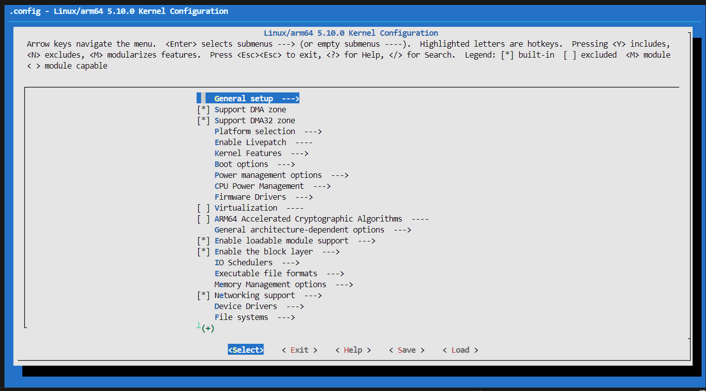 进入 open_source/linux/linux-5.10.y,执行 make ARCH=arm64 CROSS_COMPILE=aarch64-v01c01-linux-gnu- menuconfig,修改 Linux 内核配置: