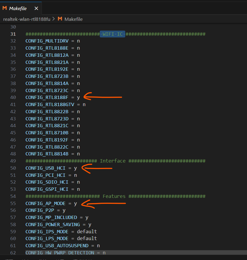 修改 Makefile,首先设置 CONFIG_RTW_DEBUG = n ,然后按下面几张图配置修改: