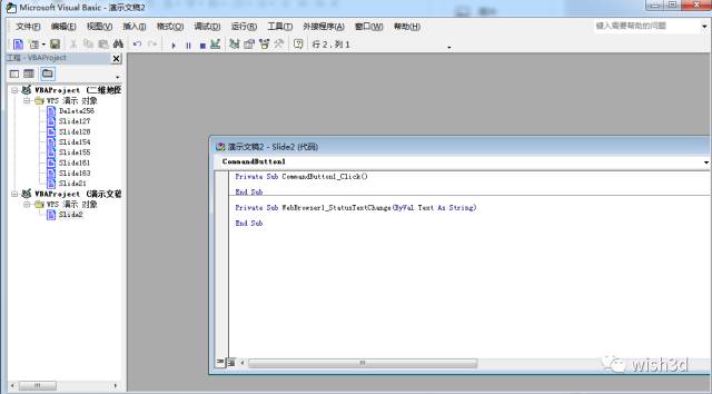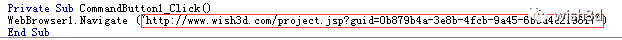 想要在web browser中看到各命令按钮所代表的三维场景,我们需要在每个命令按钮的VBA代码里加入三维场景的地址。这里我们以五象塔为例。