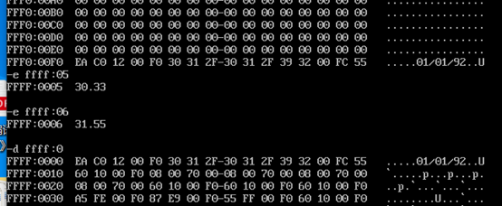 PC机主板上的ROM中有一个生产时期,在内存FFF00H ~ FFFFFH的某几个单元中,请找到这个生产时 期,并试图修改它。