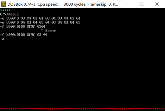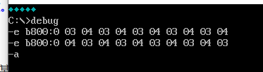 把内存单元区间b800:0f00 ~ b800:0f9f连续160个字节,依次重复填充十六进制数据03 04。