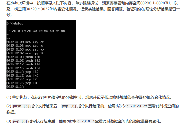 问题2:单步调试到汇编指令 push [6] 执行结束, pop [6] 执行之前,使用 d 20:20 2f 查看此 时栈空间数据,给出实验截图。