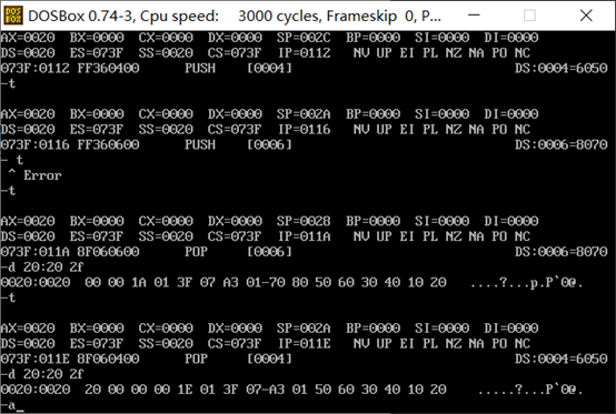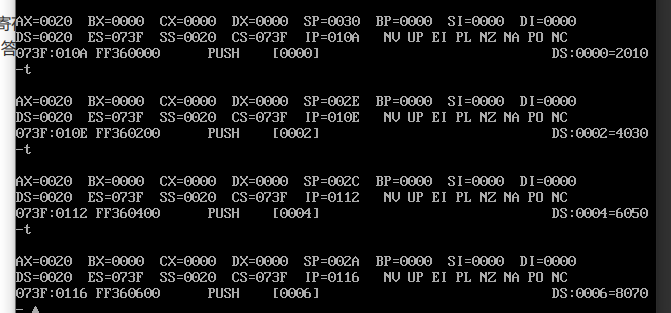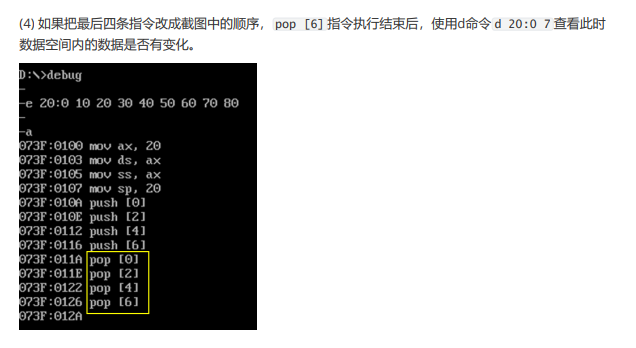 问题4:如果把最后四条指令改成截图中的顺序, pop [6] 指令执行结束后,使用d命令 d 20:0 7 查看此时数据空间内的数据是否有变化。给出实验截图。
