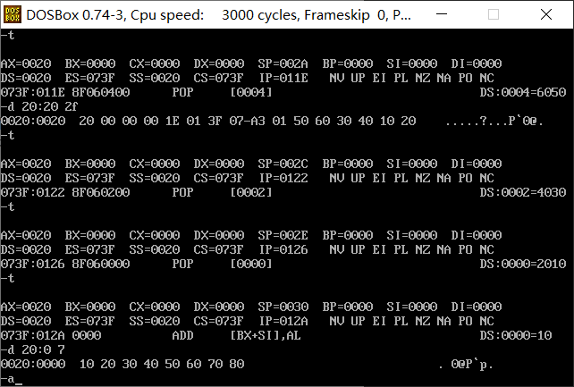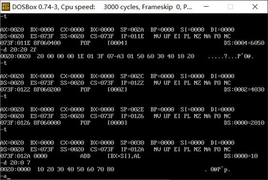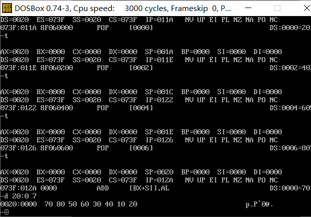 问题3:汇编指令 pop [0] 执行结束后, pop [0] 指令执行结束后,使用d命令 d 20:0 7 查看此 时数据空间内的数据是否有变化。给出实验截图。