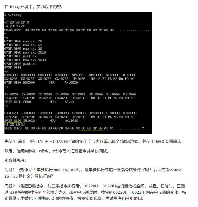 问题1:题目要求是把00220H ~ 0022fH用作栈空间。指令 mov ss, ax 和 mov sp, 30 执行后, 栈顶的逻辑地址和物理地址分别是?