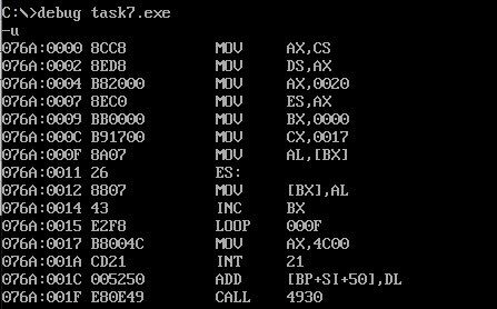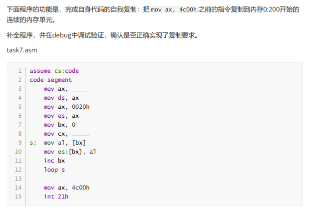 assume cs:code code segment mov ax,cs mov ds,ax mov ax,0020h mov es,ax mov bx,0 mov cx,23 s: mov al,[bx] mov es:[bx],al inc bx loop s mov ax,4c00h int 21h code ends end