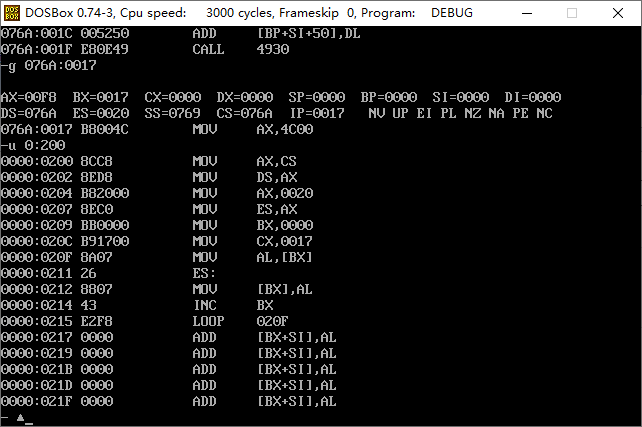 一般情况下,用T命令执行一条指令后,会停止继续执行,显示出当前CPU各个寄存器的状态和下一步要执行的指令,