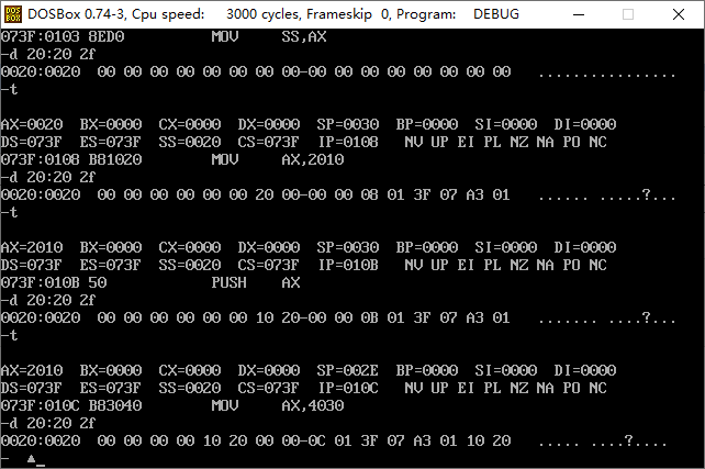 在debug中使用t命令单步调试是利用cpu的中断实现的,发生中断时会将栈中的内容改变