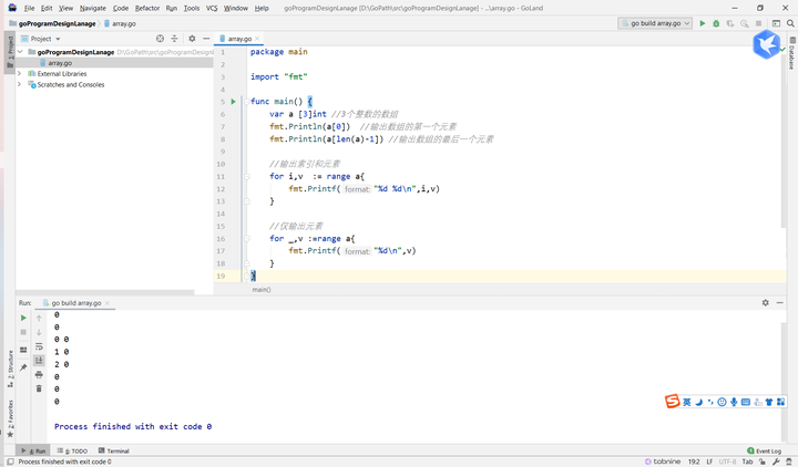 大家可以注意到,我们刚才在上面的代码中只是声明了一个长度为三的整型数组,并没有进行数组的初始化。那之前在Go语言程序结构之声明里面我们学过,在Go语言里面,我们声明变量Go编译器会自动给变量赋予零值,整型的零值是0。因此,上面的代码打印出来的内容就可以证明这一点。