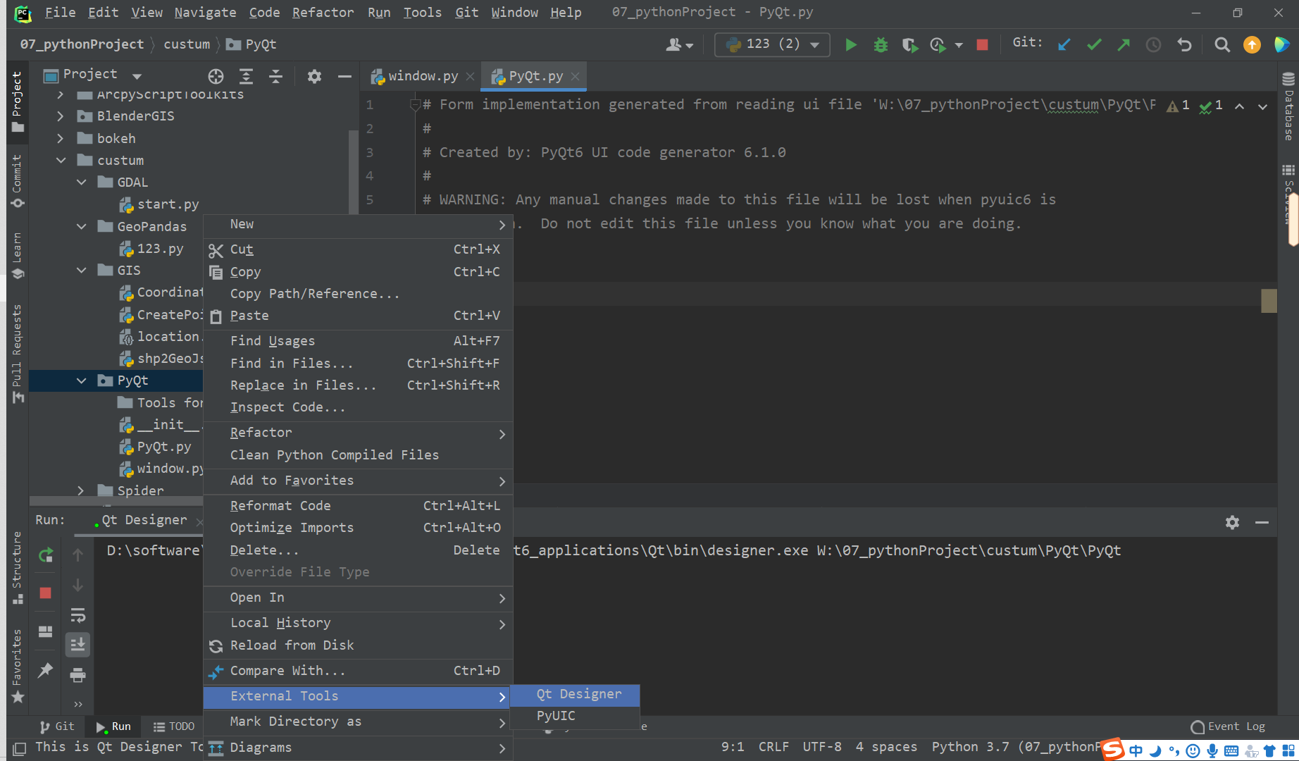 在工作文件夹上右击,依次点击External Tools-> Qt Designer:
