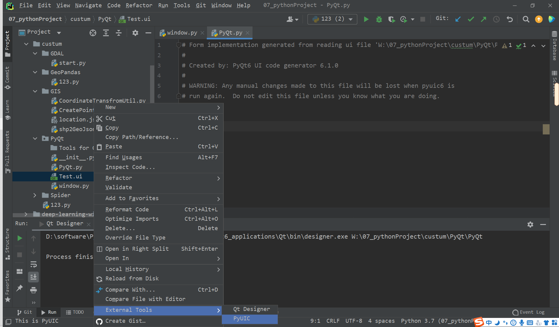 在Test.ui文件上右击。依次点击External Tools-->PyUIC,就可以完成Test.ui文件到Test.py文件的转换。