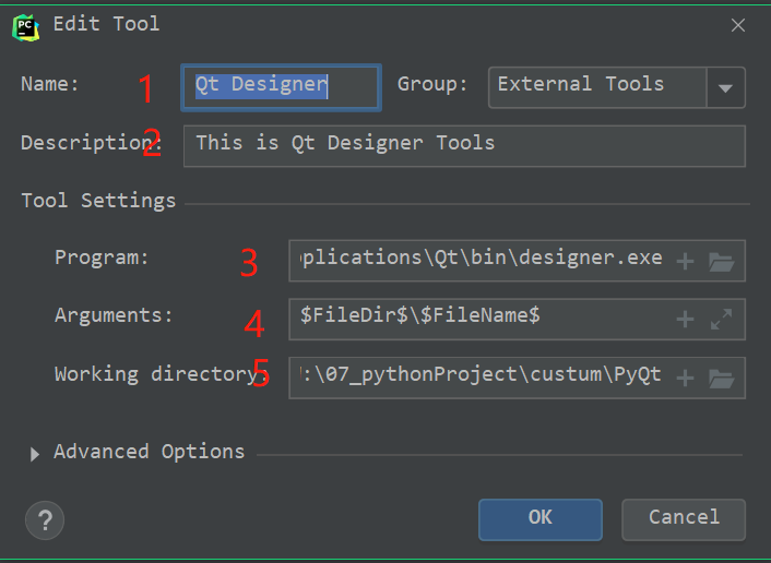 1 在这里填写Name,规范一点儿就填写Qt Designer,你也可以填写你能看懂的名称。 2 这里填写描述信息,看你自己喽,写不写都可以哈。 3 这里填写你安装好的**PyQt Designer.exe*的绝对位置,我的位置如下,大家可以参考去找自己 Designer.exe的执行文件位置。