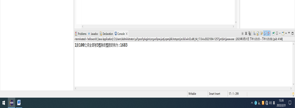 package yuan; public class helloworld { public static void main(String[] args) { // TODO Auto-generated method stub int num=0,i=1; while(i<=100) { if(i%3==0) { num+=i; } i++; } System.out.println("1到100之间全部被3整除的整数的和为:"+num); } }