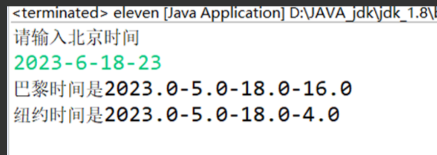 package eleven; import java.text.ParseException; import java.text.SimpleDateFormat; import java.util.Calendar; import java.util.Date; import java.util.Scanner; public class eleven{ public static void main(String[] args) throws ParseException { System.out.println("请输入北京时间"); Scanner sc = new Scanner(System.in); String s = sc.next(); // 注意格式 大小写 SimpleDateFormat si = new SimpleDateFormat("yyyy-MM-dd-HH"); Date parse = si.parse(s); Calendar c = Calendar.getInstance(); // 设置时间 c.setTime(parse); // 修改成巴黎的时间 c.add(c.HOUR_OF_DAY, -7); // 巴黎时间 double y1 = c.get(c.YEAR); double m1 = c.get(c.MONTH); double d1 = c.get(c.DAY_OF_MONTH); double h1 = c.get(c.HOUR_OF_DAY); // 修改成纽约的时间 c.add(c.HOUR_OF_DAY, -12); // 纽约时间 double y2 = c.get(c.YEAR); double m2 = c.get(c.MONTH); double d2 = c.get(c.DAY_OF_MONTH); double h2 = c.get(c.HOUR_OF_DAY); // 输出巴黎时间 System.out.println("巴黎时间是" + y1 + "-" + m1 + "-" + d1 + "-" + h1); // 输出纽约时间 System.out.println("纽约时间是" + y2 + "-" + m2 + "-" + d2 + "-" + h2); } }