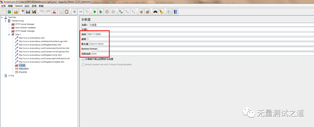增加计数器,察看结果树,聚合报告等元件和监听器,设置计数器中的参数值
