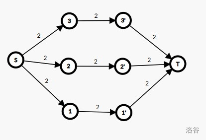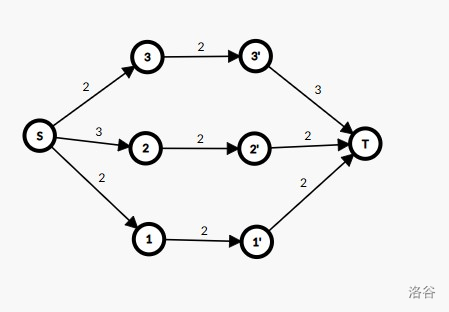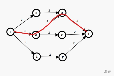 上图中可以发现 \(S\to 2,3'\to T\) 的边显然跑不满,不满足条件,但是若 \((2,3)\) 的部件可以被删除呢?