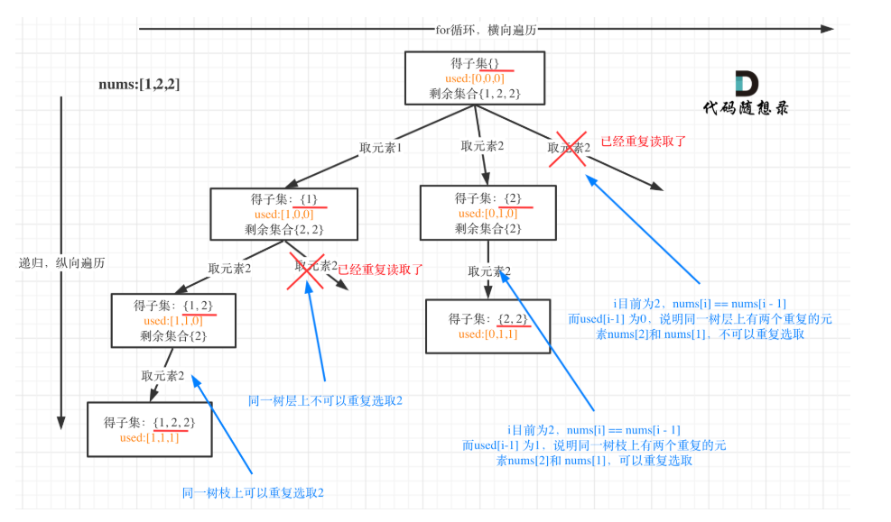 5.子集II:同一树枝可以用,同一树层不可以用,used[i]是用来判断是同一树枝还是同一树层的,