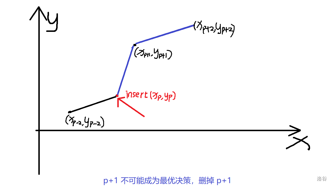 - 如图,\(P,P+1,P+2\) 三个点构成上凸包,那么 \(P+1\) 点不可能成为最优决策,删掉 \(P+1\),直到 \(P\) 右侧只有一个点或 \(P,P+1,P+2\) 三个点构成下凸包。