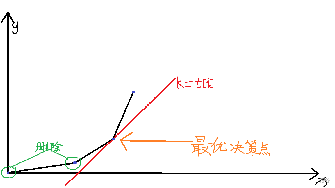 使 \(dp[i]\) 最小,就要让 \(k=t[i]\) 这条直线去截点 \((x,y)\),截距最小,则解出的 \(dp[i]\) 最小。