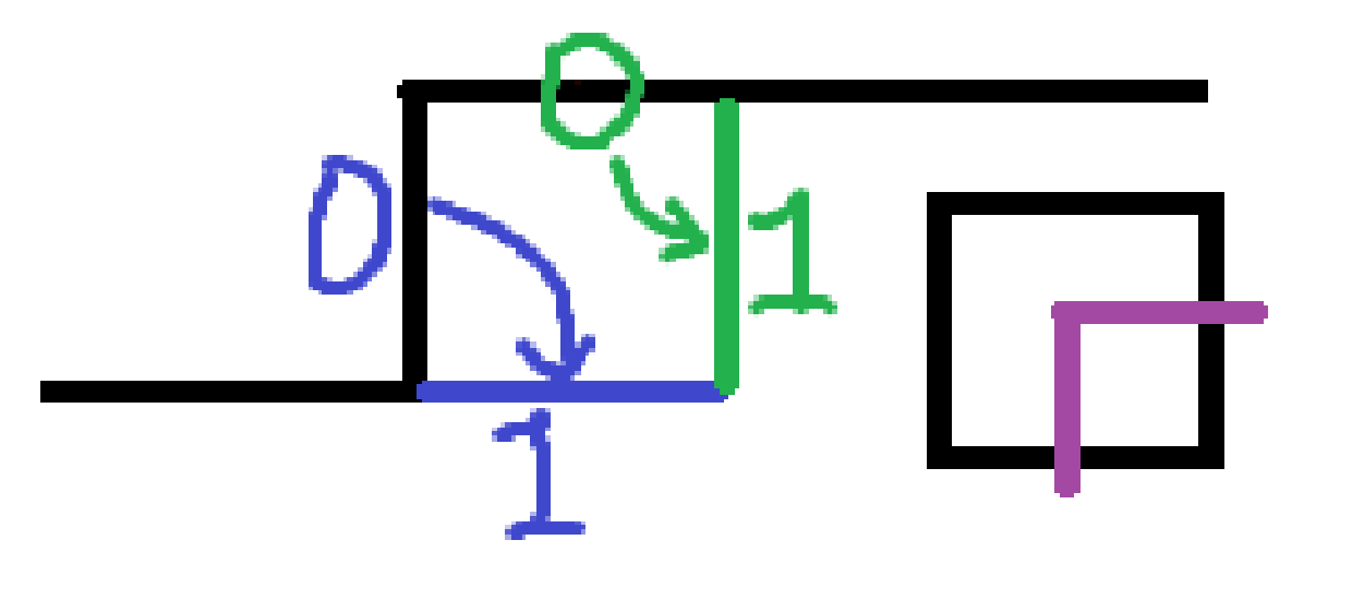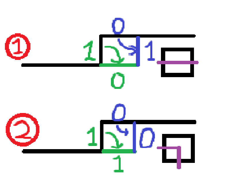 转移合法的条件:转移前 \(\Large{\text{②}}\) 处不能有插头。转移后,\(\Large{\text{①}}\) 处一定没有插头。相当于把原最终状态 << 1(二进制压缩,其余进制的压缩同理)。