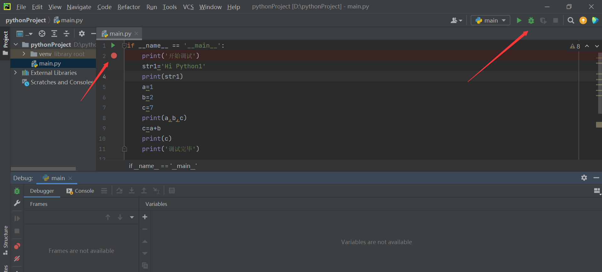首先编写程序,并打好断点,选择右上角的debug模式,再点击一次圆圈位置就可去掉断点