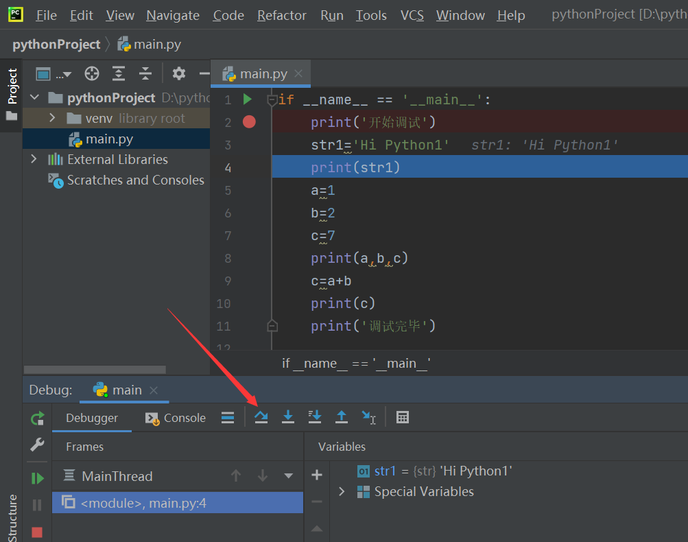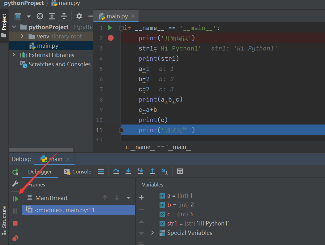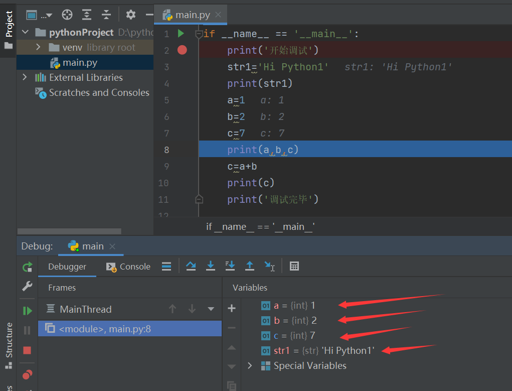 每一次向下执行,都会将变量的值展示出来,如str1=’Hi Python’,a=1 b=2 c=7,以便程序员更准确的定位错误