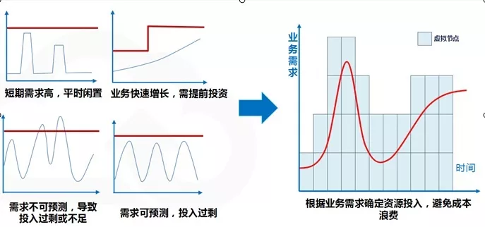 传统构架中,应用系统投产上线之前,往往难以较准确地预估未来运行所需资源量,一般通过对业务量进行估计来决定采取配置资源的规模,如果按照波峰需求建设将造成大量浪费,可能为应对短期业务量高涨,需长期持有并维护过量资源。同时也可能因为估计不足,业务快速增长时,可能会因扩容不及时导致资源超负荷运行,业务响应缓慢甚至拥堵,带来诸多风险。