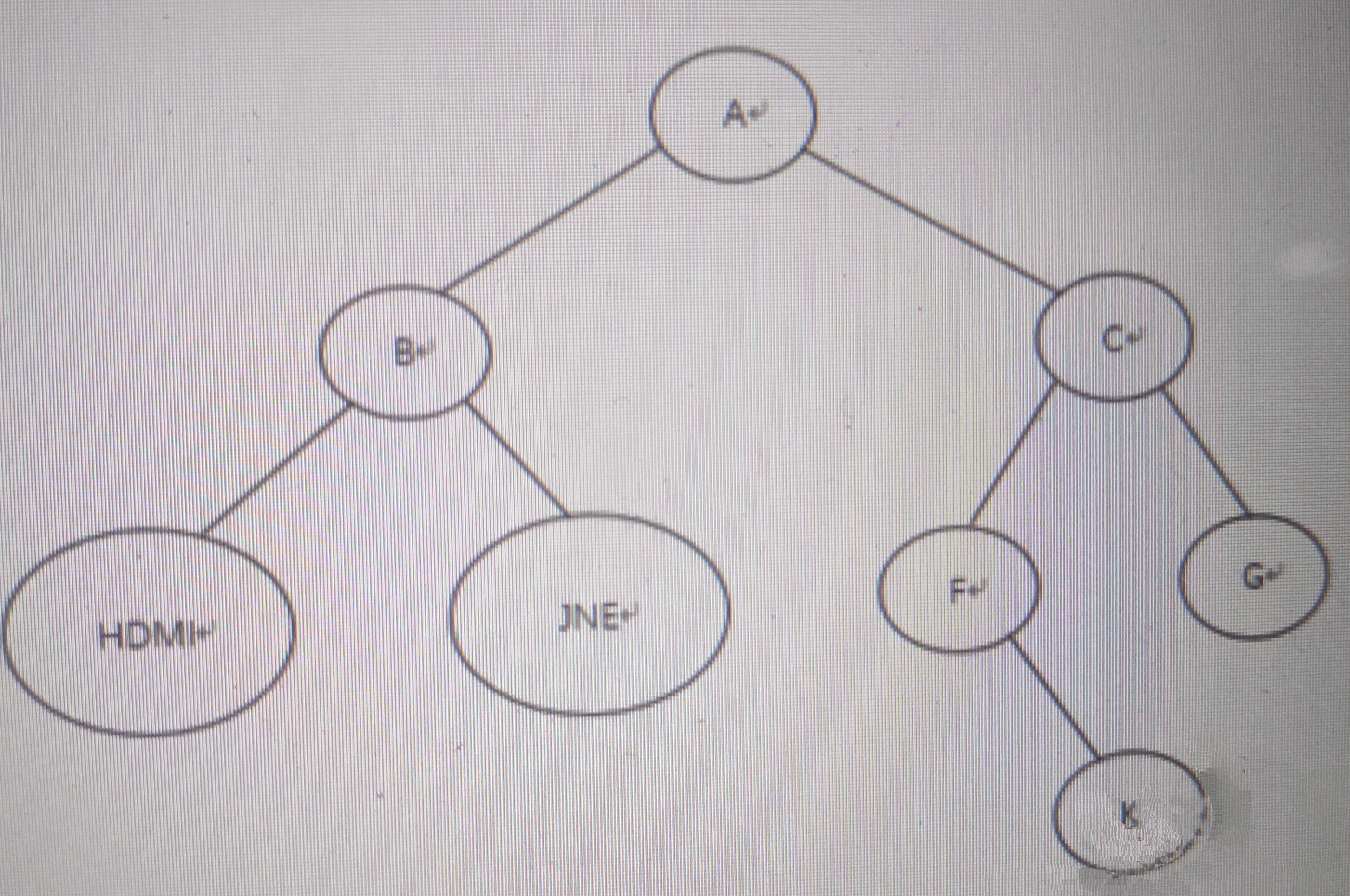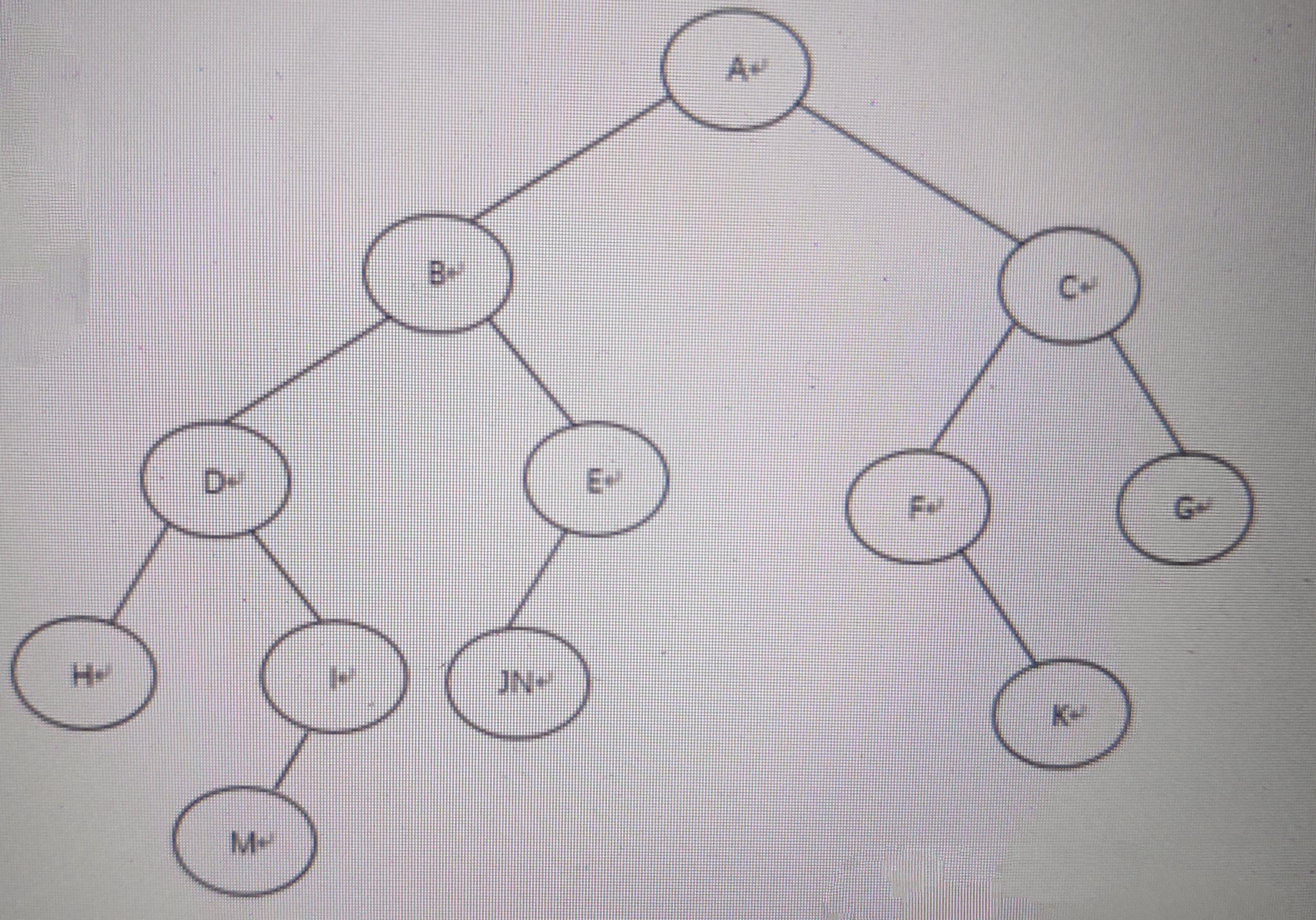 最后看JN的中序:JN,后序:NJ,根据后序特性看出,J是根,中序看出N是J的右子树。那么整体的二叉树就出来了,如图所示