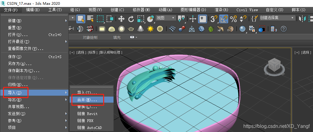 如果我们想把之前做好的细胞核和线粒体都添加到当前工作场景中的话,就需要用到导入这个渠道,而且要以合并的形式才可以。