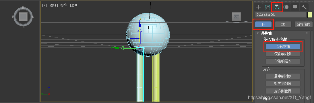 选择命令面板中的轴——》轴——》仅影响轴,然后将圆柱体的轴延z方向拖拽上移至圆柱体的顶端。