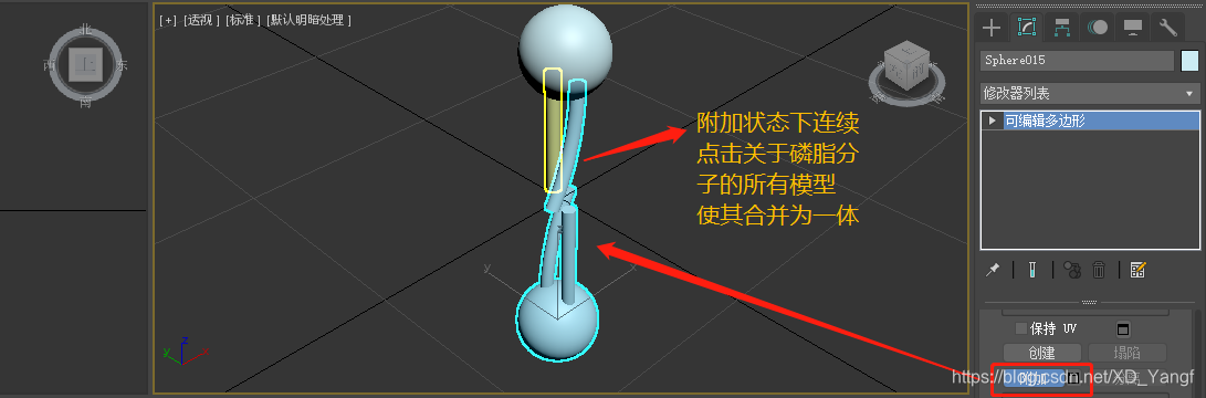 附加完后,发现模型整体都变成了球体的颜色,这时我们需要重新给模型各部件赋予颜色(此时,我已将磷脂分子尾巴的长度缩短了,因为太长最后结果不太好看,因此关于磷脂分子的结构大家可以根据实际情况自行调整)。