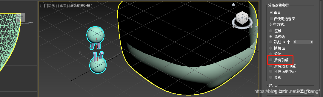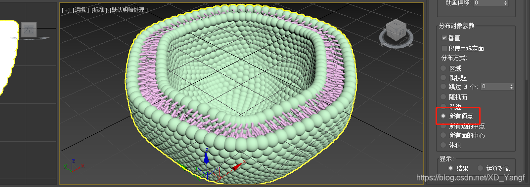 最后将分布方式改为所有顶点即可完成磷脂双分子层细胞膜的建模。注意,这里如果最终的结果不合适,即磷脂球太小或太大,导致成型的膜上球体间的间隙太大或球体之间太过拥挤,可以返回去再缩放下磷脂分子的大小。
