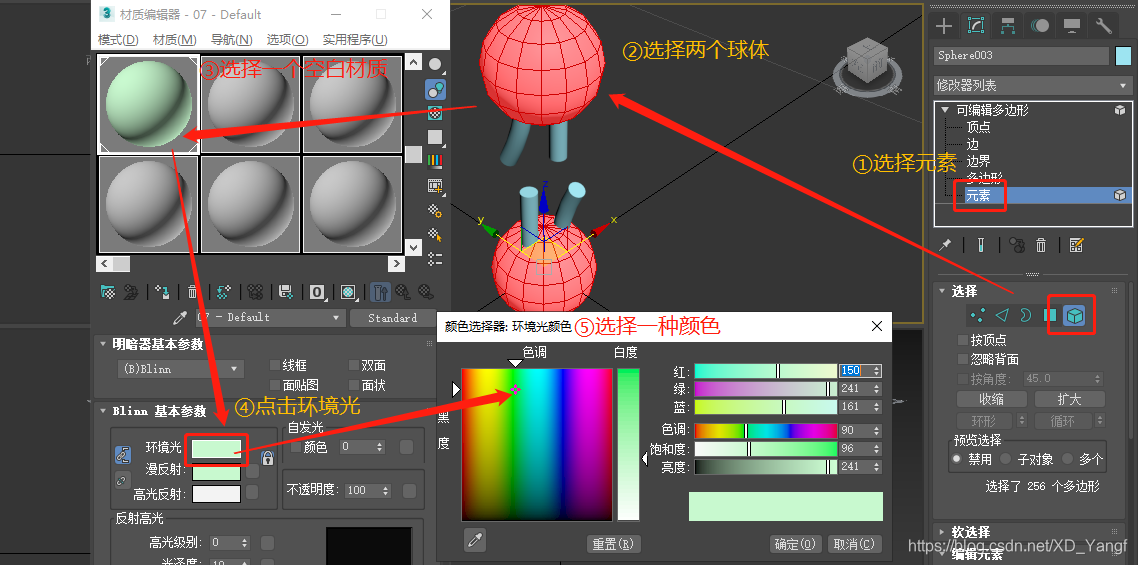 首先,选中合并后模型中的两个球体,然后按M键打开材质编辑器。默认情况下,选择任意一个空白的材质,然后点击基本参数中的环境光,选择一种颜色,最后点击按钮——将材质指定给选定对象(下图中忘标了,下一张图有标)——以将材质效果赋给两个球体。