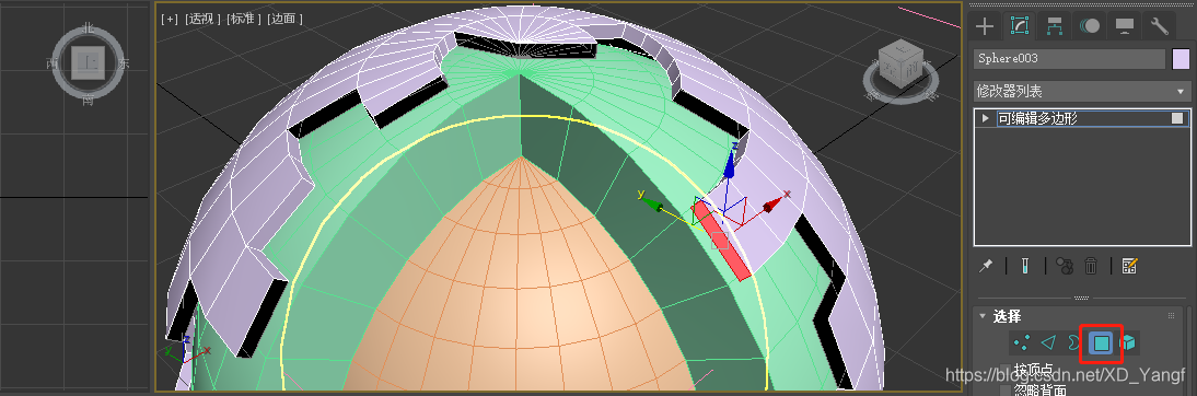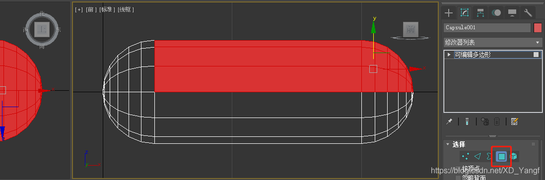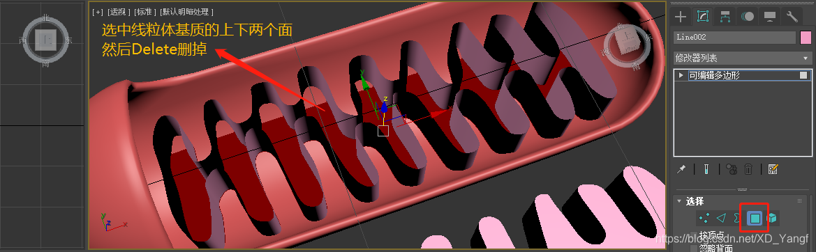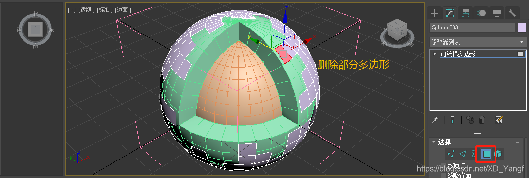 转换为可编辑多边形后,选中并删掉下图中所示的多边形部分。