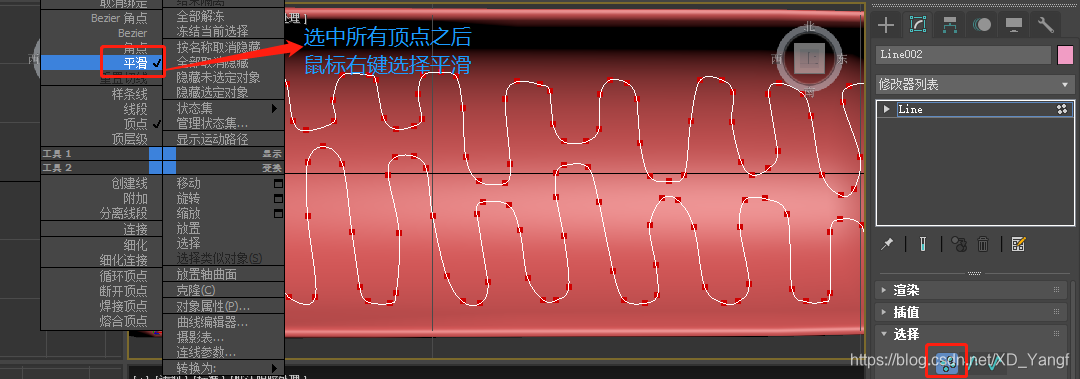 将线条转换为可编辑样条线,选中所有顶点,并在界面处点击鼠标右键,选择平滑。此操作可实现对线条的平滑,同时可继续点击并移动单个顶点进行微调。