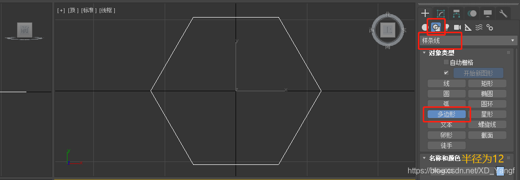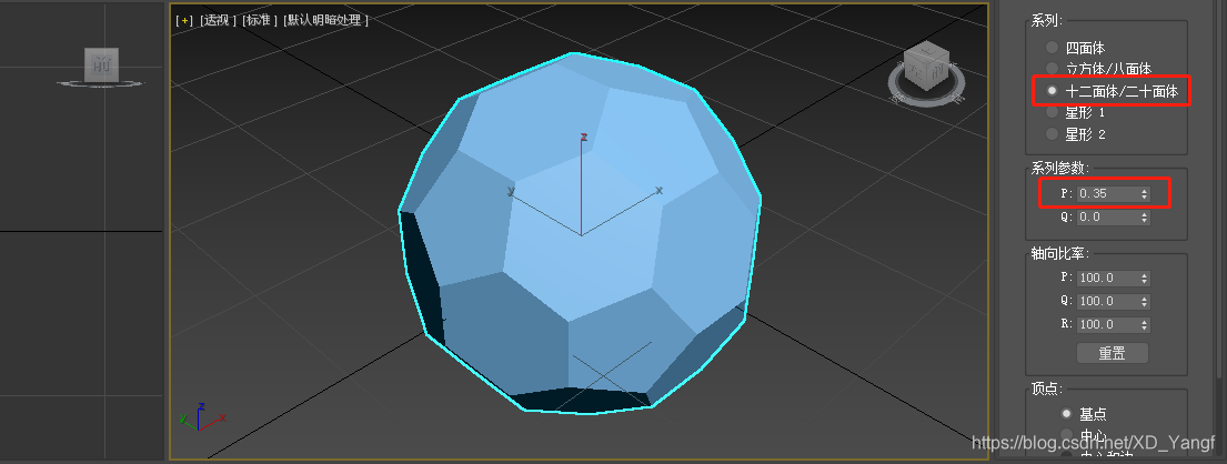 创建一个异面体,并选择十二面体/二十面体类型,半径为12,系列参数P为0.35。